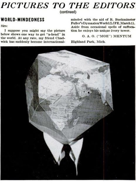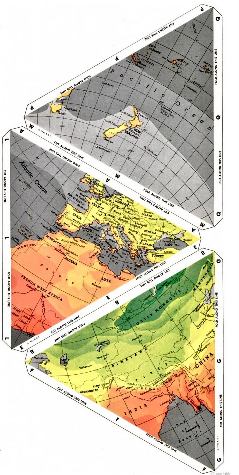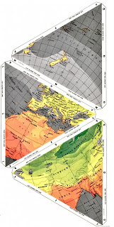 I've always been interested in maps and different projections and how they make such a difference in the way the world looks when a sphere is projected onto a flat surface. Yesterday my wife sent me this link to an issue of Life Magazine from March 1, 1943. On page 41 of this issue they discuss a new (at the time) projection from Buckminster Fuller, a famous inventor who is now most well-known for his geodesic spheres and houses made out of them. This projection is called The Dymaxion World, and can be folded up to form a geometric object known as a Cubeoctahedron. While the point of the projection is to have a flat-map with desirable properties such as low distortion and the ability to have all of the landmasses contiguous, I just think it looks cool folded up to form a bizzare globe. Note: Fuller eventually decided on another polyhedron, the icosahedron, to use for The Dymaxion World. It is a much "rounder" shape that actually looks like a globe. I've made those before and I don't think they look nearly as cool.